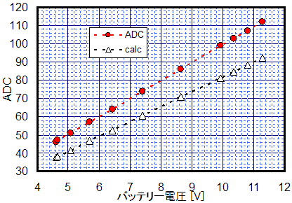 バッテリー監視のための回路変更とADC値の調査をしなおしました。 バッテリー電圧を 10kΩ, 330Ωの抵抗分割で ADC (Vref=3.3V) に入力。 計算値とはズレているが、リニアリティもあり、ADC値を 1/10 すれば電圧になるので、調整はしないで様子を見ることにしました。