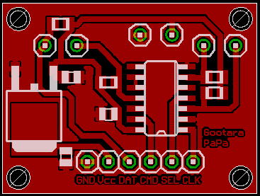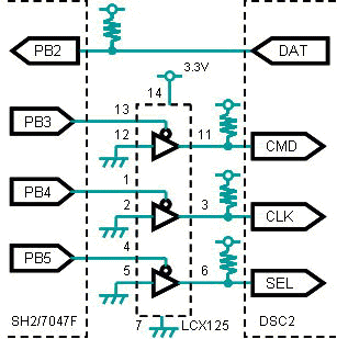 先日作っていた基板の1つを仕上げてみました。 5V I/O のマイコンから 3.3V の DSC2 の受信をするというものです。 ソフトウェアは前日公開分。 ハードは、74LCX125 と 10kΩのプルアップ抵抗。 DAT 信号はプルアップのみで直接接続しています。