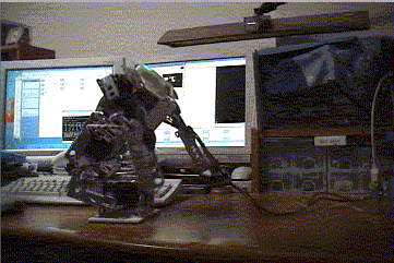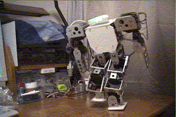 直立安定位置が決まったところで、静歩行。 ジャイロONだと、計算による歩行の時に、重心が右、左に振れるのを打ち消そうとして動作してしまうため、安定して歩けない。 不整地を歩かせようとすると、ジャイロを入れないといけないし、どうしたものか。。。(以前、動歩行を行ったときも、ジャイロOFFの方が安定している) このあたり、ヒントが欲しいなぁ。。。