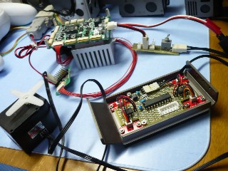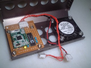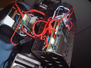 | 今回の制御系は、頭とランドセルの2つに分けて 搭載してます。 それぞれの場所には、 ・頭部分 各種センサー、AD変換機、SD-Card、 サーボへの分配機を搭載 ・ランドセル LiPo電池、メインCPUボード、 デバッグ用にZiGBEE を搭載 神のところで放熱ファンの搭載がありましたが、 ジゴローはまじめに放熱のために搭載しています。 これのおかげで、CPUは冷え冷え状態です。 隠しモードでもばっちり動作してます。 |