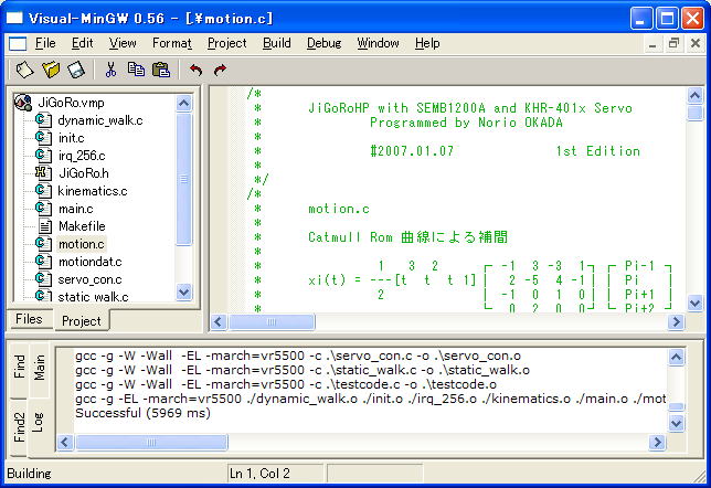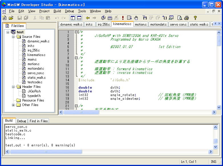 第1回は、ロボットの製作記事とV850タイマを使ったPWM出力、第2回はセンサ、コントローラ接続と、逆運動学にもとづく計算と制御、第3回が、歩行計算(動歩行)といった感じです。 簡単にいえば、JiGoRoのボディをつかってV850ES/JG2マイコンで制御してみました、というところです。