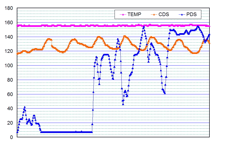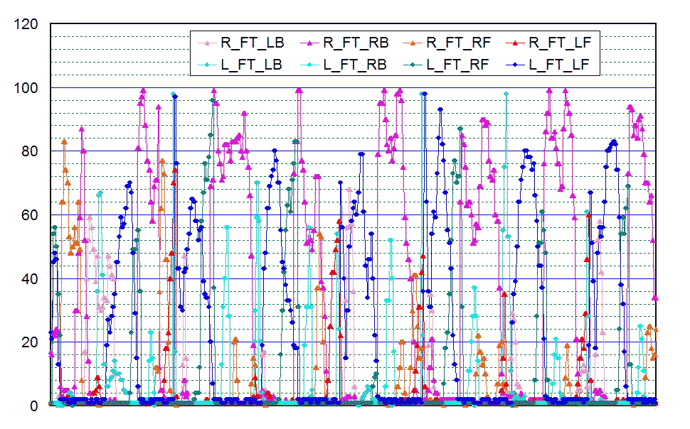 動歩行計算をさせて歩かせているとき、不安定な歩行をするときがあるので、まず調査。 ログから乱れたところを探したところ、同時刻の図A〜Fのような状態があった。 不安定歩行は、足裏にかかる力に規則性がでていない様である(図A)。 いわゆるZMP予測がずれているのでしょう。 また、多少負荷がかかったくらいでは、電位ドロップは大きくない。 強いて言えば、サーボでの電流を喰っているときに、バッテリーの電圧も落ちるが、バッテリーのパワーがあるため、電位差が大きくなっているが、ほんと測定誤差程度(図B)。 図C,D,Eは 3D モーションセンサ値。 前方に進んでいるだけなのに、ジャイロZ軸が大きく振れている。 もしかして、X,Y,Z軸のイメージを(私が)勘違いしているのかな? また、加速度があまり安定していない。 地磁気はサーボモータの影響を受けていない様子で、一様に変化している。 方向はしっかりと把握できそう。 その他センサ値として、ジャイロ付近の温度を取っているが、比較的温度が安定している(ずっと動かしていたので、安定した雰囲気になっているのでしょう)。 頭上に置いたCDSが波打っているが、これはCDSの固定が不安定なため、ブルブル震えて光源を向いたときに下がっているものと思われる。 PDSが途中で大きく変わっているのは、障害物が現れたためでしょう(たぶん、自分の手)。
