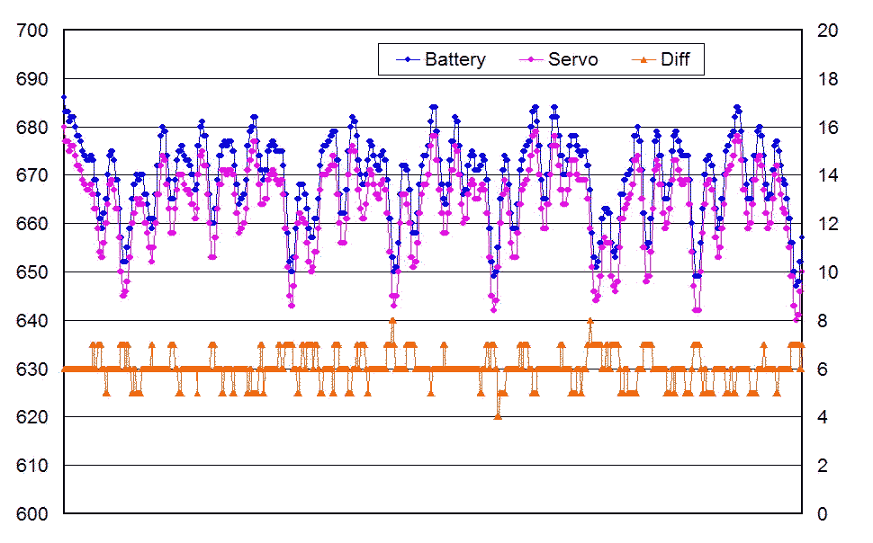 | 図A:足裏センサ測定結果 | 図B:バッテリとサーボ供給電圧(と、その差分) |