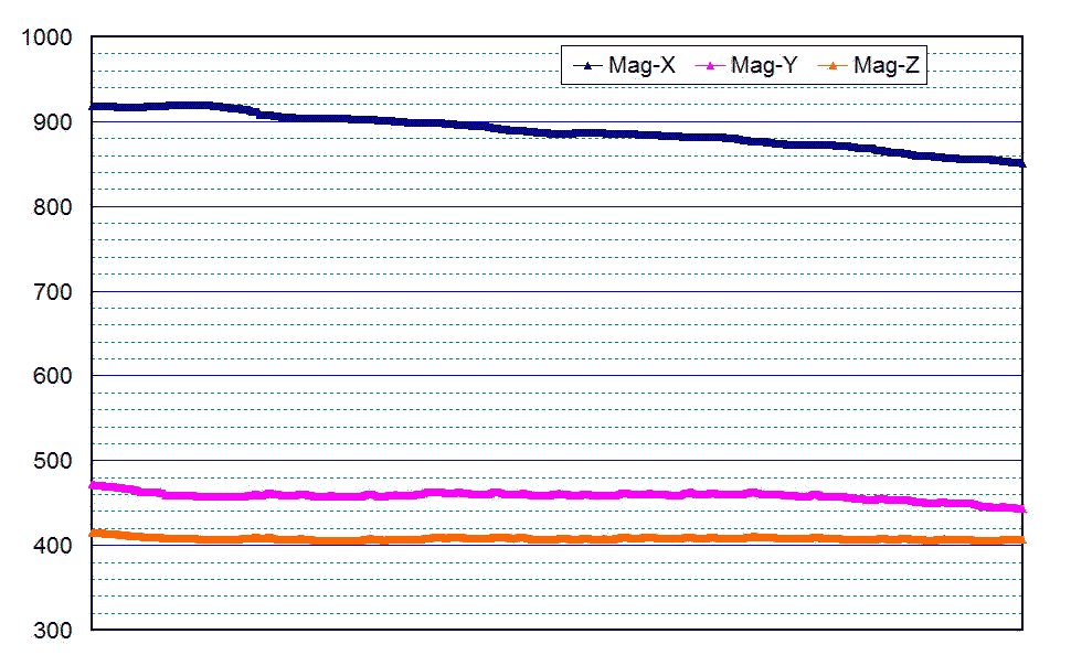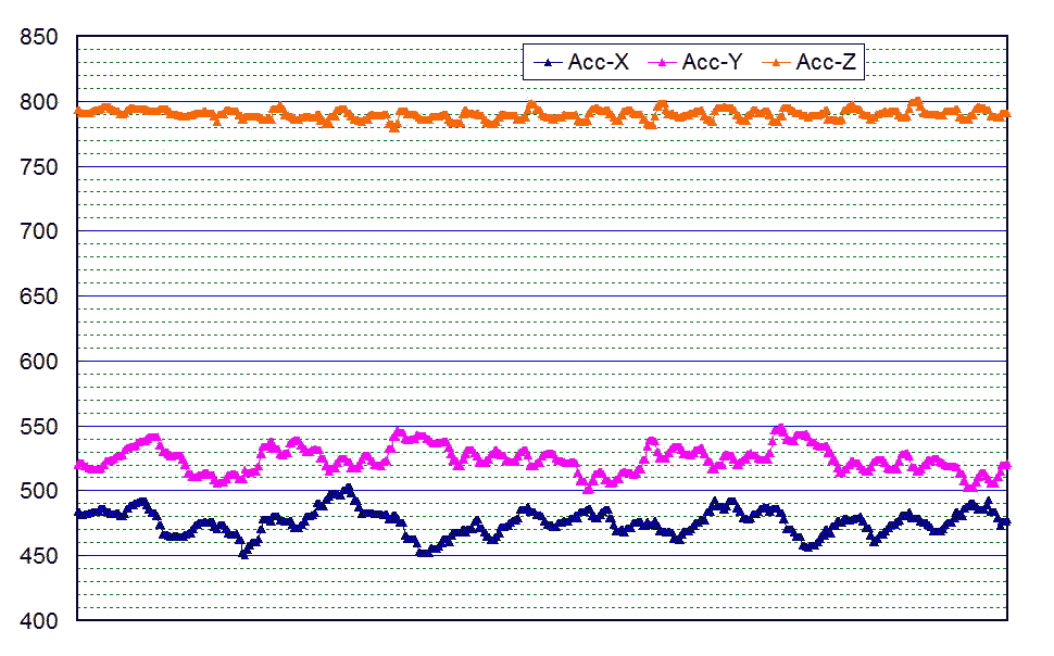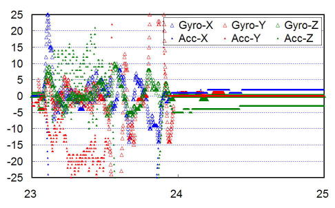 ここで、7時間x3日の連続動作を行いました。 展示しながら実験をさせていただきました。 近日発売予定のアナログボードと3Dモーションセンサーの調子をデータログとして FLASH-ROM に落としてみました。 結果、起動直後、皆さんが触った時の変動、等において、ジャイロ(MEMS)のオフセット補正は正しく行われているようでした。 以下、参考までに、ジャイロと加速度のデータを載せておきます。