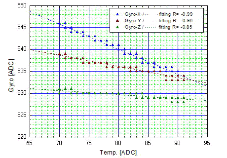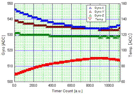 MEMSというデバイスの特性上、温度に対しての補正が必要になります。 安定になっているタイミングでオフセット補正をしても良いのですが、ロボットのように常時動いている場合には、オフセット補正するだけの信憑性のある静止が得られない場合があります。 そこで、単純ではあるのですが、温度センサーをジャイロ付近に設置し、静止保管、外気温度変化の調査をしてみました。