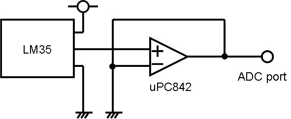 温度センサーはナショナルセミコンダクター製のLM35(秋月電子通商で購入できます)が4V以上の動作保証で、出力が 0 [mV] + 10.0mV/℃ (2℃〜150℃) のため、3.3V仕様のADC端子に直結もOKですが、怖いので、左図のように Rail-to-Rail 法で介すようにしました。 (本当は、別のセンサの増幅に使った OP-AMP の1つがあまっていたので、使いました)