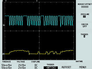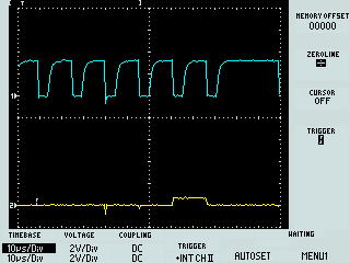 黄色の線がDAT信号。 入力パルスが鈍るのと、H電位が低くなりすぎます(約1.8V程度)。 これだと、CPUで H に切り替わったことが認識できません。