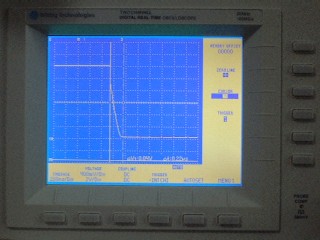 パルス立ち下がり(エミッタフォロア回路) 入力波形は問題なし(影響を与えてない)。 出力波形も0.1μsec 以下の遅延であった。 |