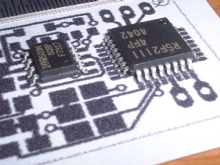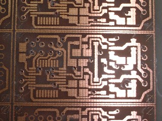 昨日のベタ部分のピンホールは今回は出てませんでした。 露光時間を短くしたことがよかったものと思われます。 インクジェット専用フィルムで焼き付ける場合、8分程度でOKのようなので、次は、これでテストしてみたいと思います(使用環境:ちびライト−基板距離 約6cm)。 ビア作り、ショートチェックをして問題なければ、実装に入りたいと思います。
