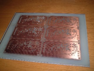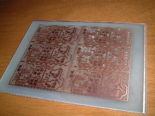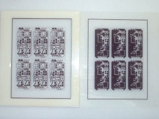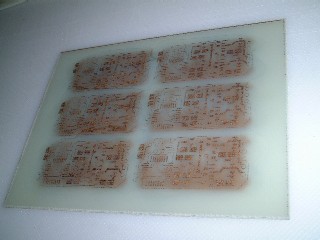 見ていただいたとおり、結構、両面の位置ズレも小さく、断線もない状態で仕上がりました。 本当は、ちょっと露光時間が短く、全面露光して追加現像処理をしたんですけどね。 テスト基板を1枚(片面)で作って、先日のミスがどこで生じているのか?を確認しながらやりました。 結果としていえないところが悲しいのですが、印刷したフィルムを見ると、先日のベタ部分にみえた模様があったので、露光時間が多すぎる、という点が1つ怪しげだったので、露光時間を思い切って6分にしたのですが、足りませんでした。 ということで、全面露光という形でしたが、追加2分程度実施し、薄皮一枚残っていたレジストを取り除きました。
