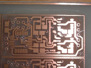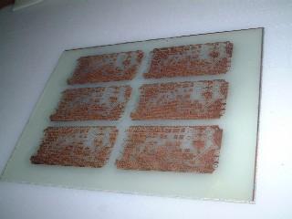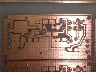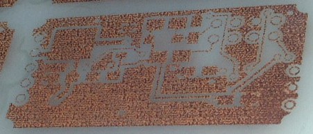 | 表面 細い配線が消えかかってるのに加えて パッドまでもがピンホールの嵐でした。 裏面が透けて見えてますが、エッチングの 時もこれが残渣として残ってるのではないか? と錯覚したものでした。 |