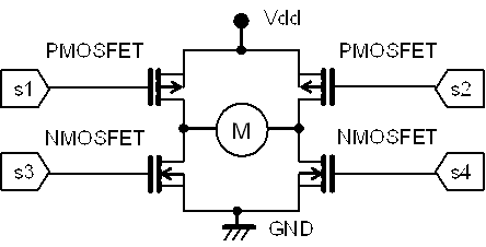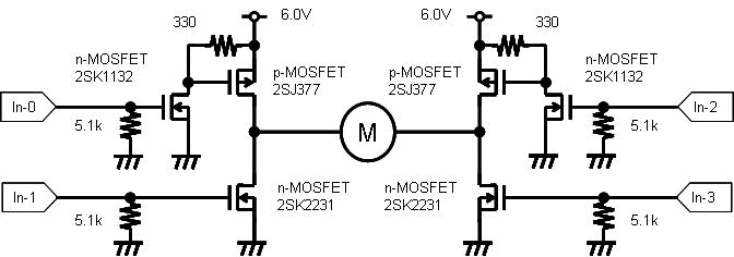 Hブリッジに使うトランジスタの種類としては、パワートランジスタか、パワーMOSFETか?です。 パワートランジスタが電流増幅素子に対して、パワーMOSFETは、制御電極(ゲート)に電圧を印加することで