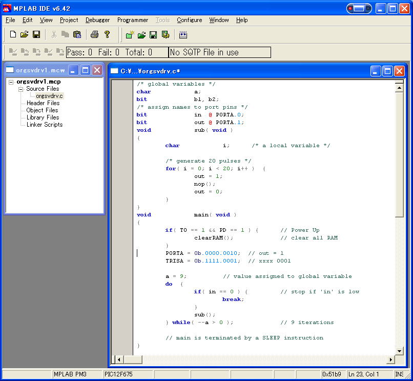 です。 CC5X は MPLAB IDE 上で動作するため、free で PIC の統合環境を得ることができます。 以下に実例を挙げますが、中身は適当ですので、そのまま使うことは避けてくださいね(全く動作保障できませんので)。