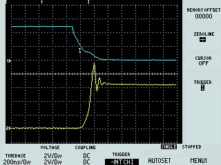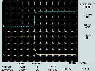 パルス立ち下がり(5.1kΩプルダウン抵抗回路) 入力波形もブロードになり、その影響で、出力波形 が、0.3μsec程度遅延がみられる。 |